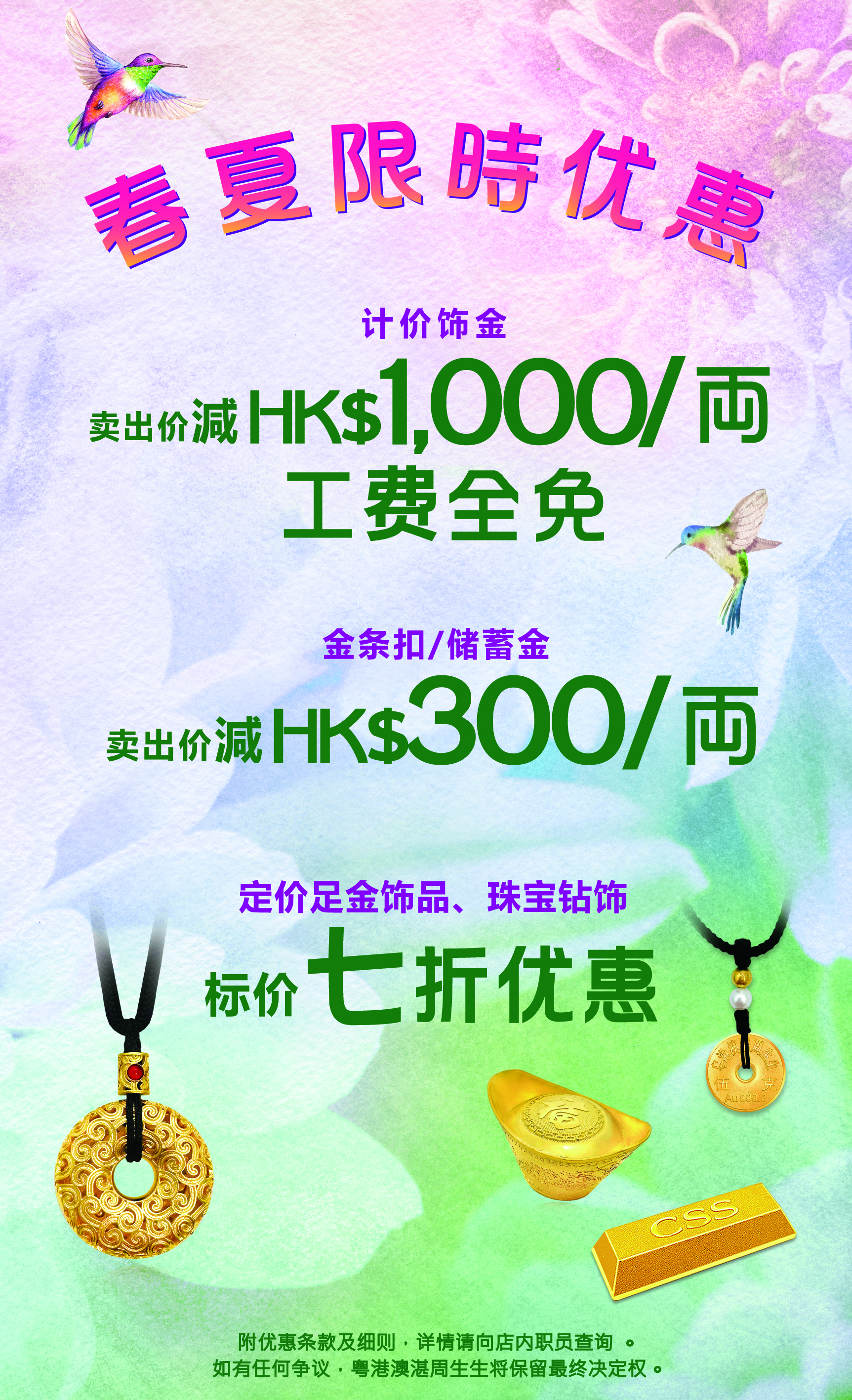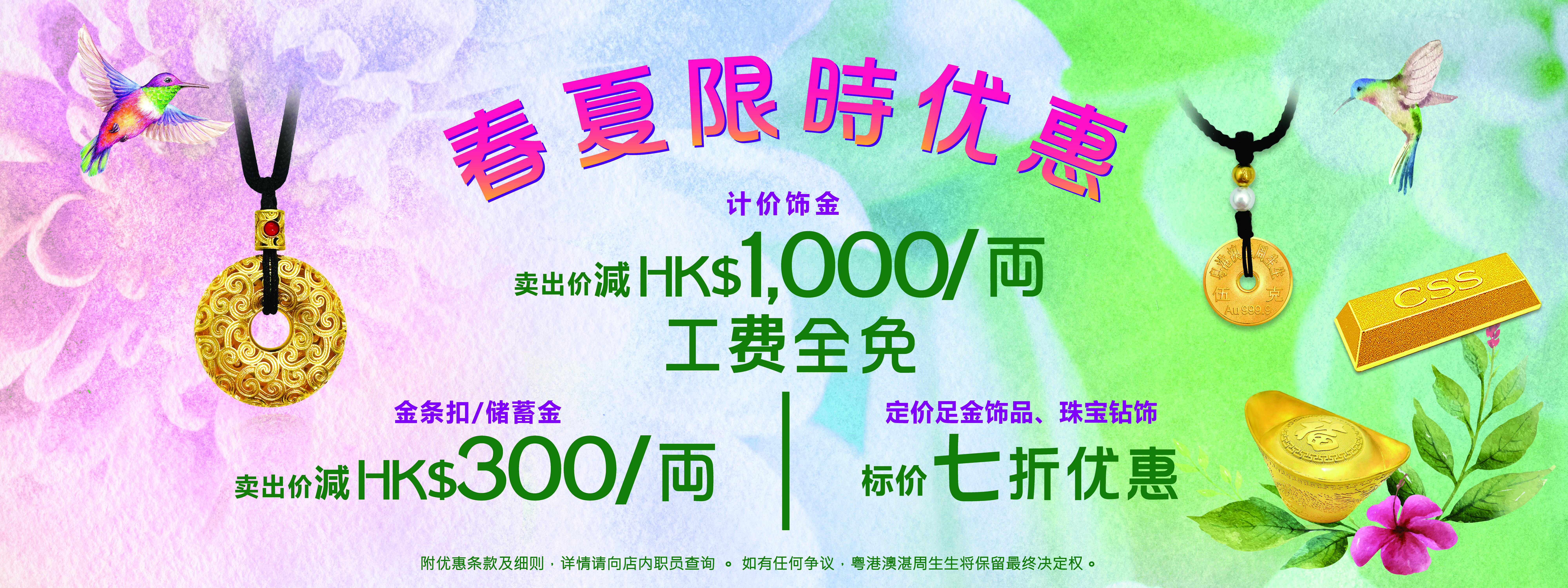 于港、澳门市选购计价黄金饰品,饰金牌价每両减HK$1,000 ∕ MOP1,000。优惠受条款约束,详情请向店员查询。